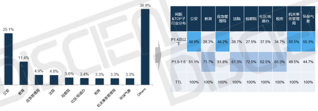 2、分細(xì)分行業(yè)看:公檢法、教育、應(yīng)急等釋放的項(xiàng)目個(gè)數(shù)較高,且P1.5-1.6與P1.4以下的應(yīng)用存在明顯的行業(yè)差異;